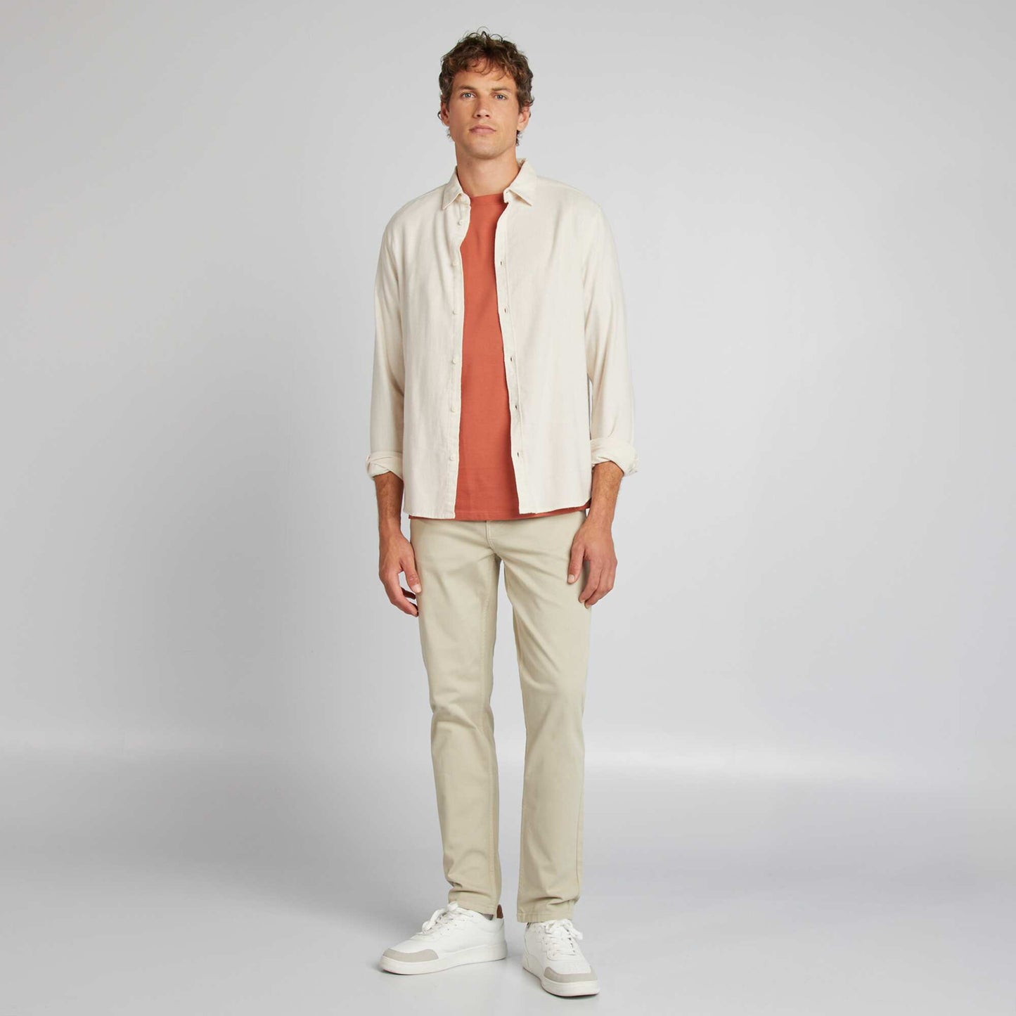 Les meilleurs ventes : L'incontournable pantalon du quotidien. Celui qui passera nickel au bureau comme le week-end, avec sa coupe slim intemporelle. \n\n- Chino \n- Légèrement stretch \n- Slim fit / coupe ajustée \n- Taille standard \n- Ouverture boutonnée + zip sous patte \n- Passants pour ceinture \n- 2 poches cavalières rivetées + poche ticket devant \n- 2 poches plaquées derrière \n- Surpiqûres ton sur ton \n- Longueur entrejambe (32) : 76 cm environ - pour les personnes mesurant entre 1m75 et 1m80\n- Largeur bas de jambe : 16 cm environ \n\n- Notre mannequin porte une taille 42/L32