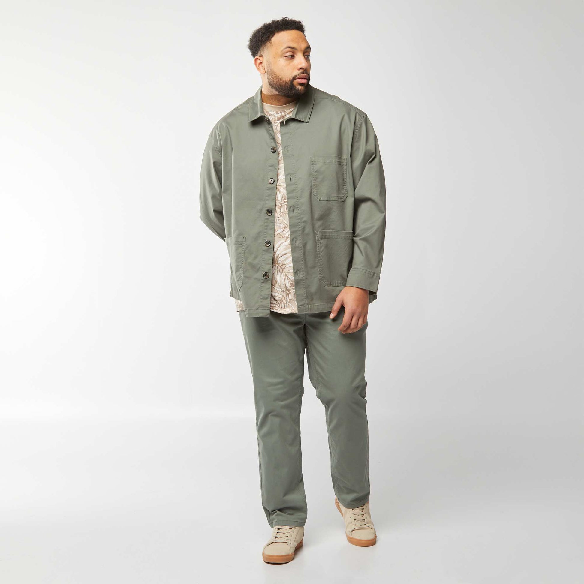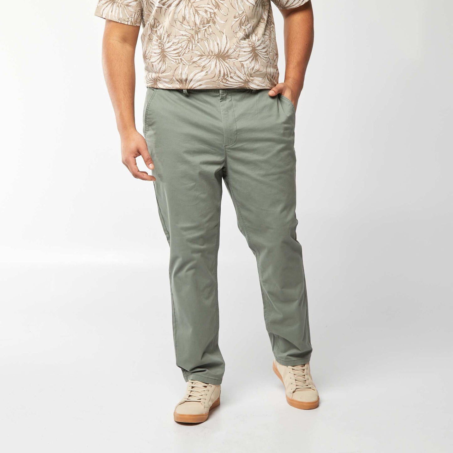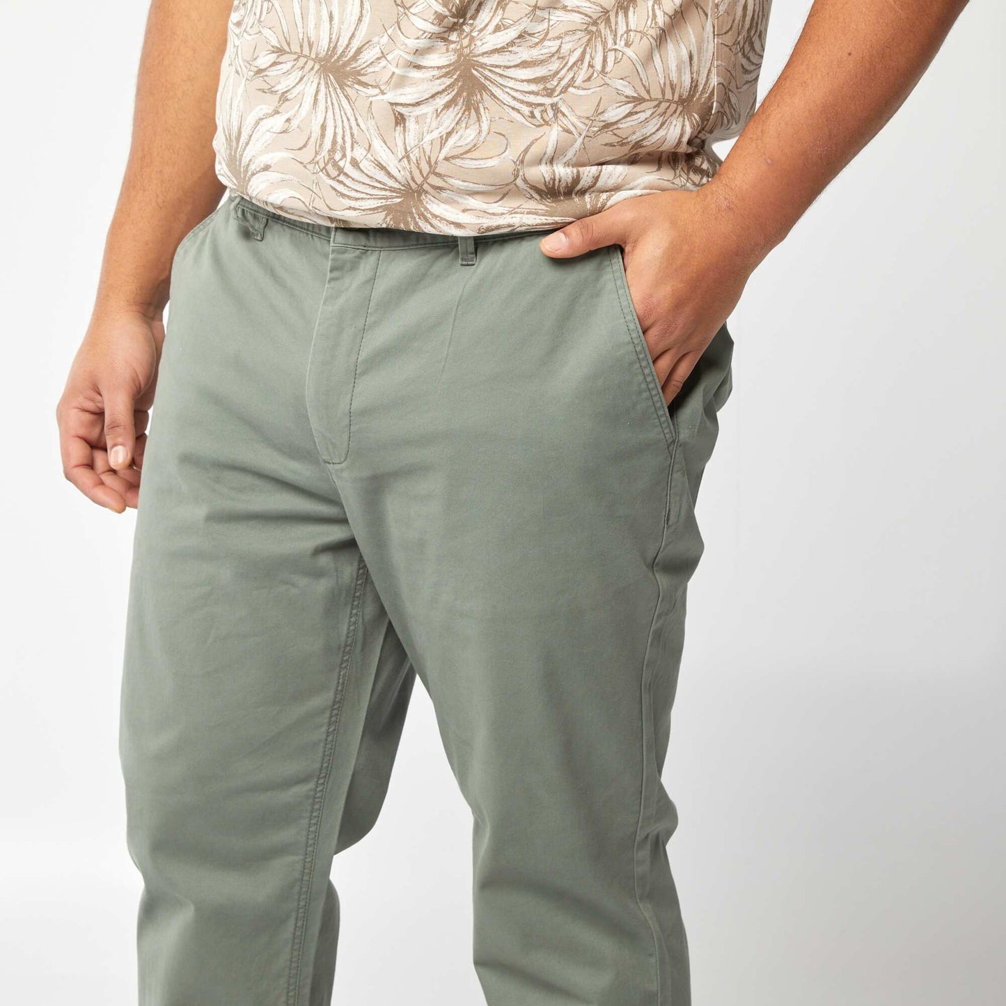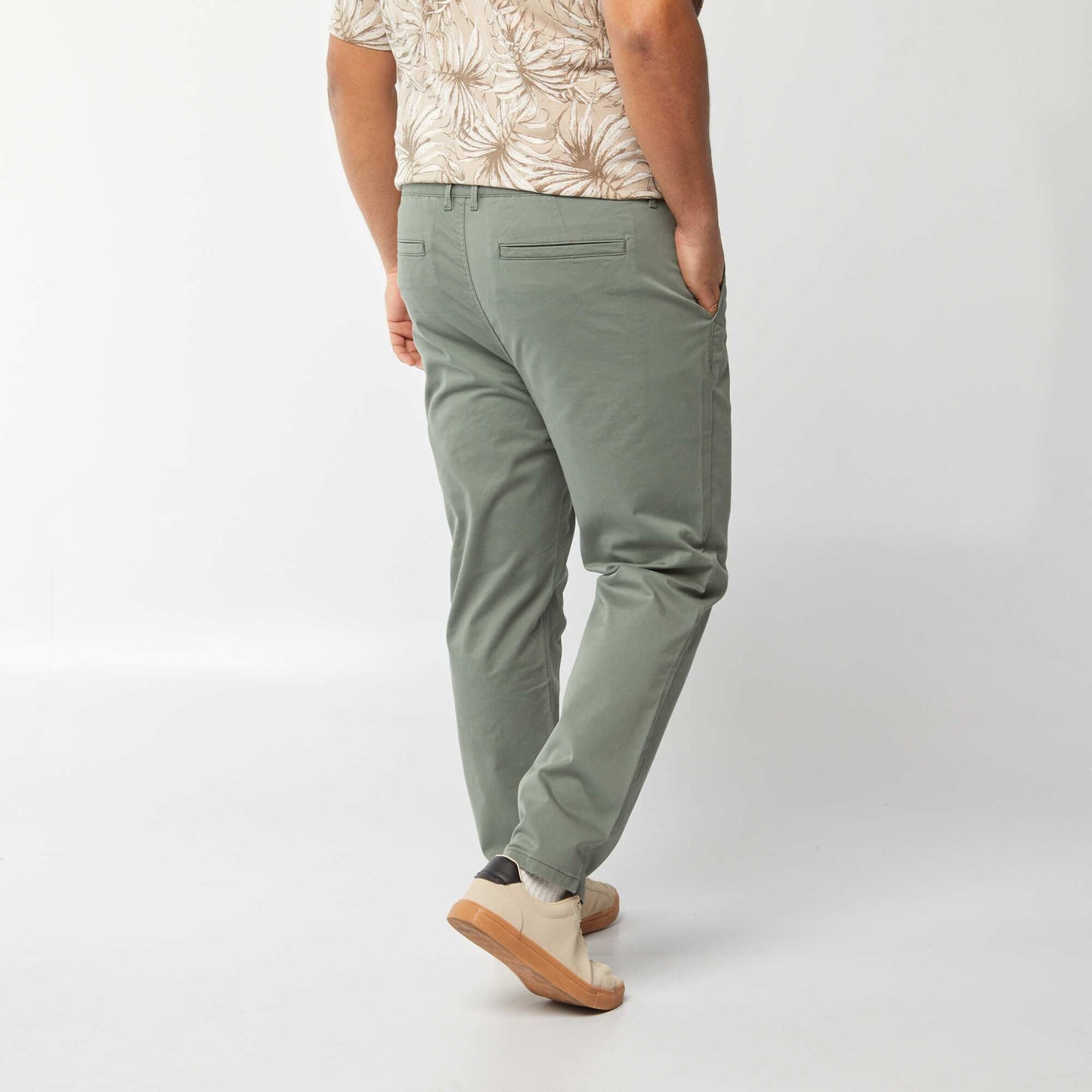 Nous avons une bonne nouvelle, son prix est en baisse :)\n\nL'indispensable chino revisité avec ses finitions travaillées et dans une coupe plus près du corps. \n\n- Pantalon chino \n- Slim / Coupe semi-ajustée \n- Longueur 32 ( pour les personnes mesurant entre 1m70 et 1m80) \n- Twill de coton stretch\n- Taille standard \n- Passants pour ceinture de 5,5 cm de largeur \n- Ouverture bouton + zip sous patte \n- 2 poches avant \n- 2 poches passepoilées au dos \n- Doublure chambray à l'intérieur de la taille \n- Finitions surpiqûres contrastées revers bas de jambes \n- couleur unie \n- Longueur entrejambe 77 cm - Pour les personnes mesurant entre 1m75 et 1m80\n- Largeur bas de jambe 20,5 cm environ\n\nNotre mannequin porte une taille 56