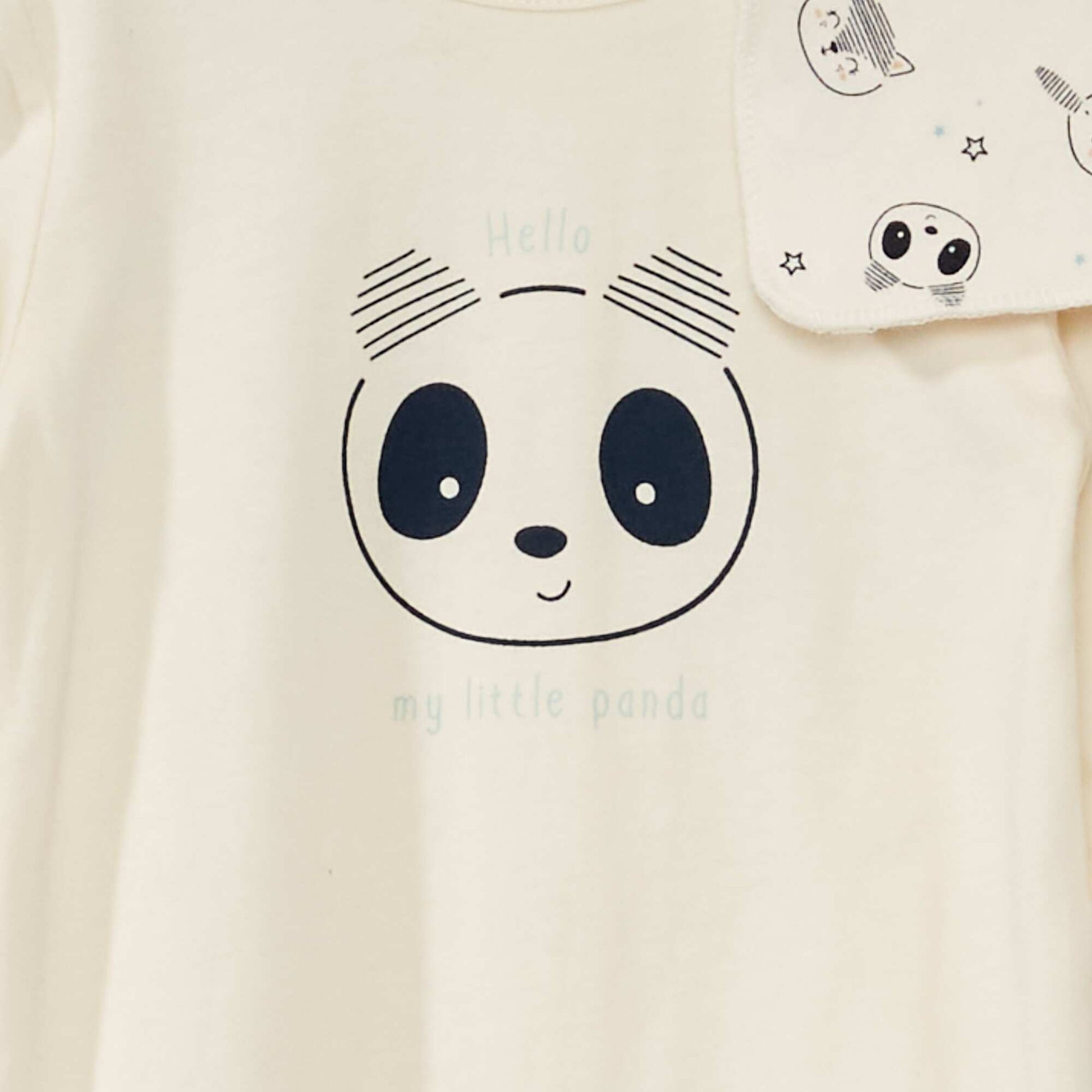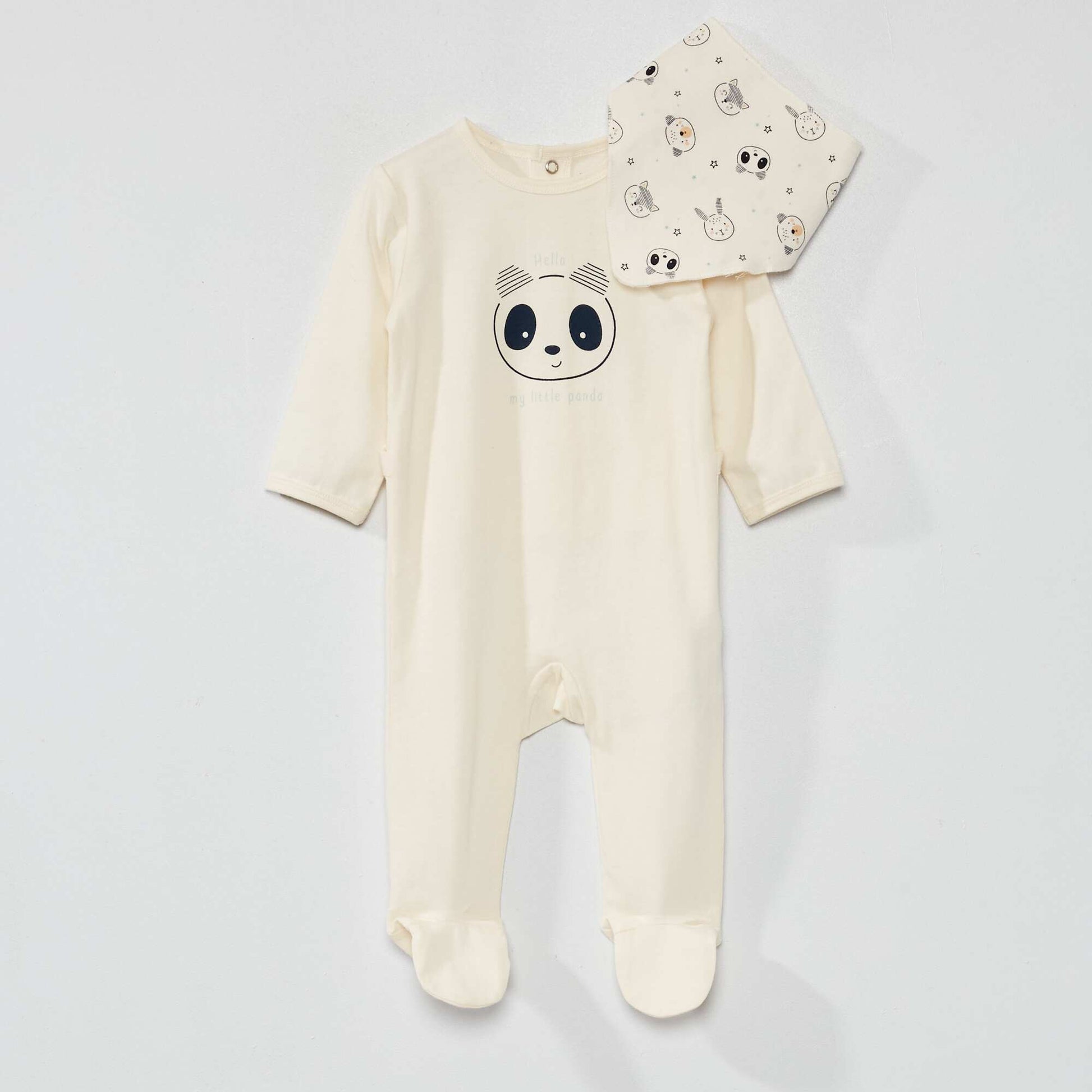 Cet ensemble est idéal pour les premiers mois de bébé. - Dors-bien en coton - 100% coton - Col rond - Manches longues - Ouverture par boutons pressions au dos - Imprimés fantaisies devant - Bavoir imprimé - 100% coton - Imprimés 'fantaisies' all-over - Ouverture par patte scratchée