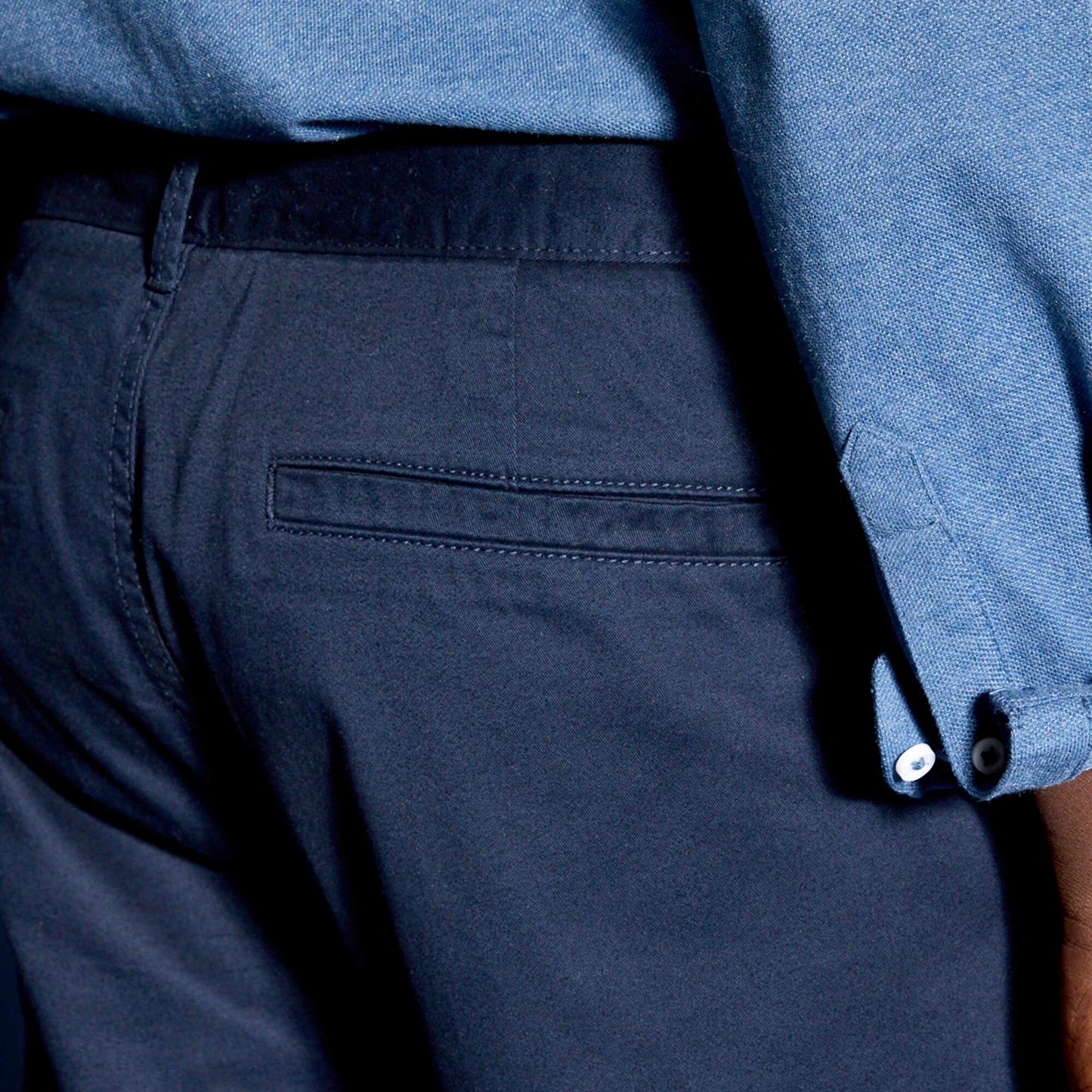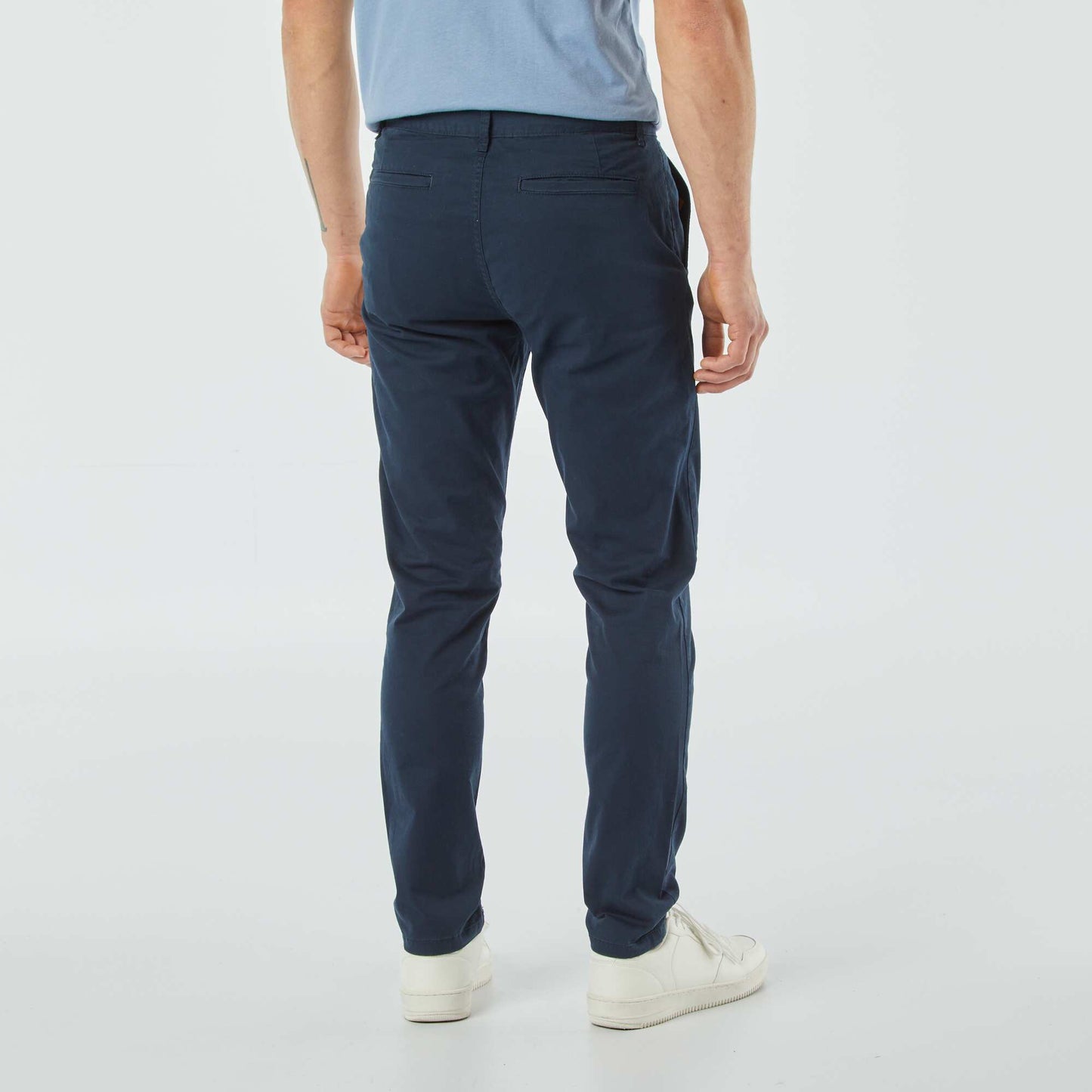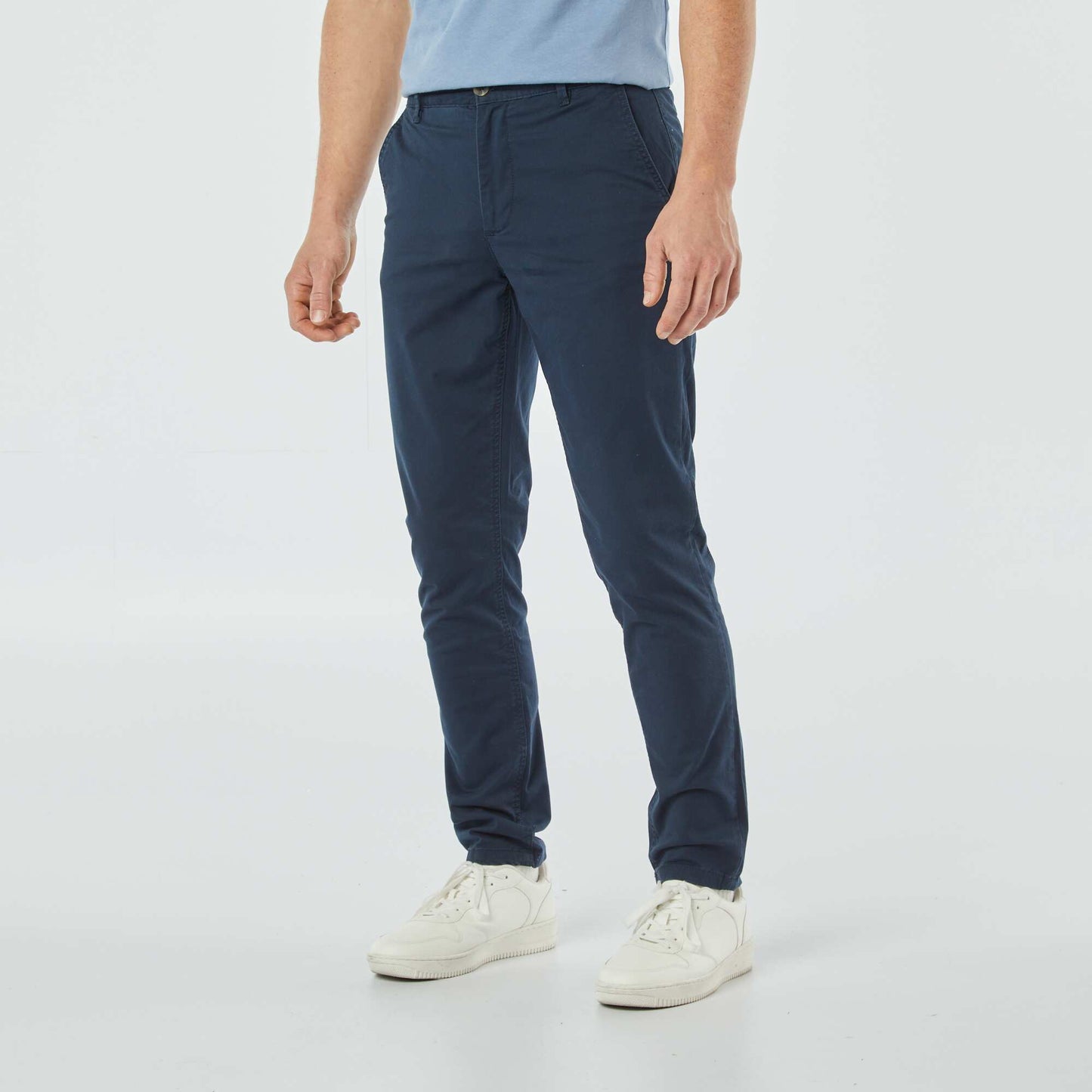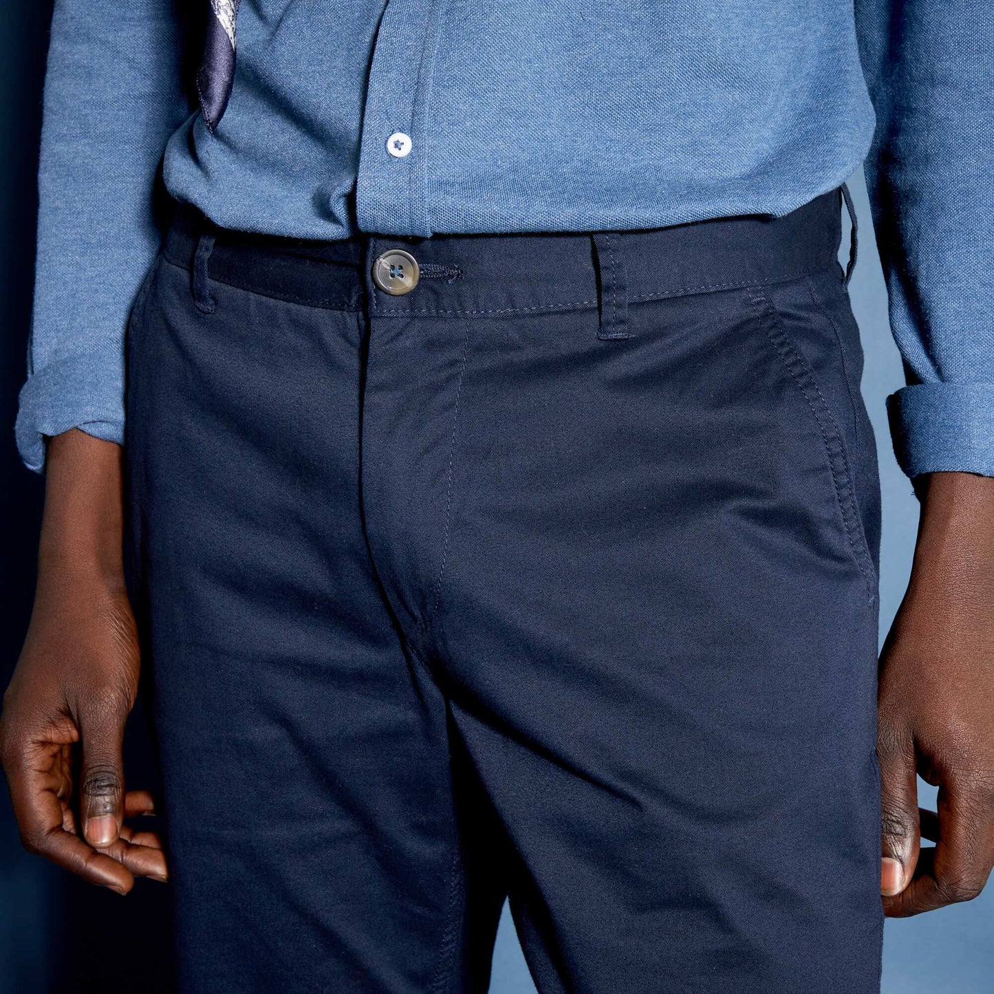 L'incontournable chino revu et corrigé en coupe slim, et dans un beau twill de coton stretch. A porter roulotté au bas des jambes pour un petit look casual chic au top ! ;-) \nPlongez dans le style décontracté et élégant avec notre chino slim à 5 poches en twill de coton stretch. Un véritable essentiel dans la garde-robe masculine. \n\n- Chino slim à coupe ajustée pour une silhouette moderne et sophistiquée.\n- Confectionné en twill de coton stretch pour un confort optimal et une grande liberté de mouvement.\n- Taille standard avec passants pour ceinture, vous permettant de personnaliser votre look en ajoutant une ceinture tendance.\n- Fermeture éclair avec bouton pour une tenue sécurisée et facile à ajuster.\n- 2 poches avant pratiques pour garder vos essentiels à portée de main.\n- 2 poches factices au dos ajoutant une touche de raffinement au design.\n- Longueur entrejambe : 81 cm environ \n- Largeur bas de jambe : 19 cm environ \n\n- Notre mannequin porte une taille 40 et mesure 1m87\n\nConseil mode / association:\nLe Chino Slim à 5 poches en twill de coton ttretch se marie parfaitement avec un style décontracté chic. Pour une tenue casual au bureau, associez-le à une chemise en denim légèrement retroussée aux manches et à des sneakers en cuir blanc pour un look contemporain. Vous pouvez également l'associer avec un t-shirt simple et des baskets pour une journée de détente en ville. Avec ce chino polyvalent, les possibilités sont infinies et le style est toujours au rendez-vous.