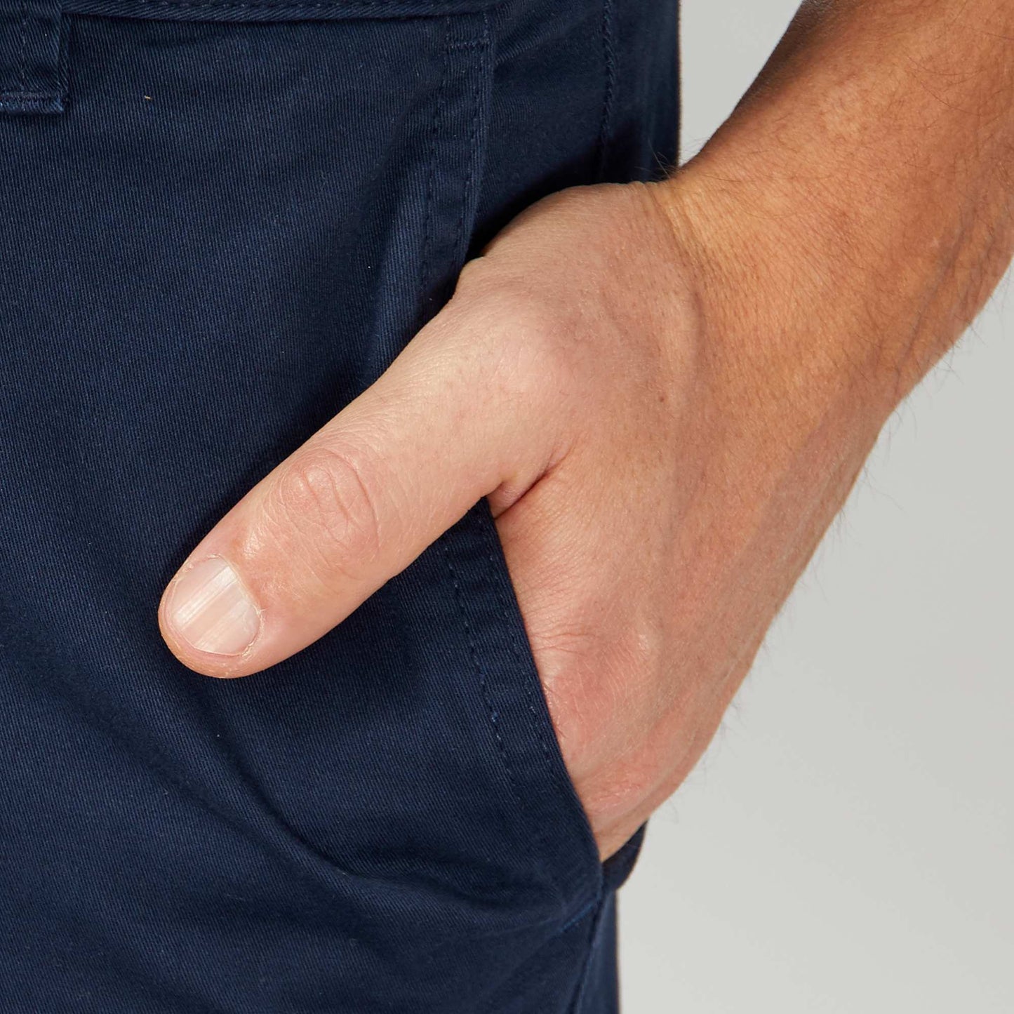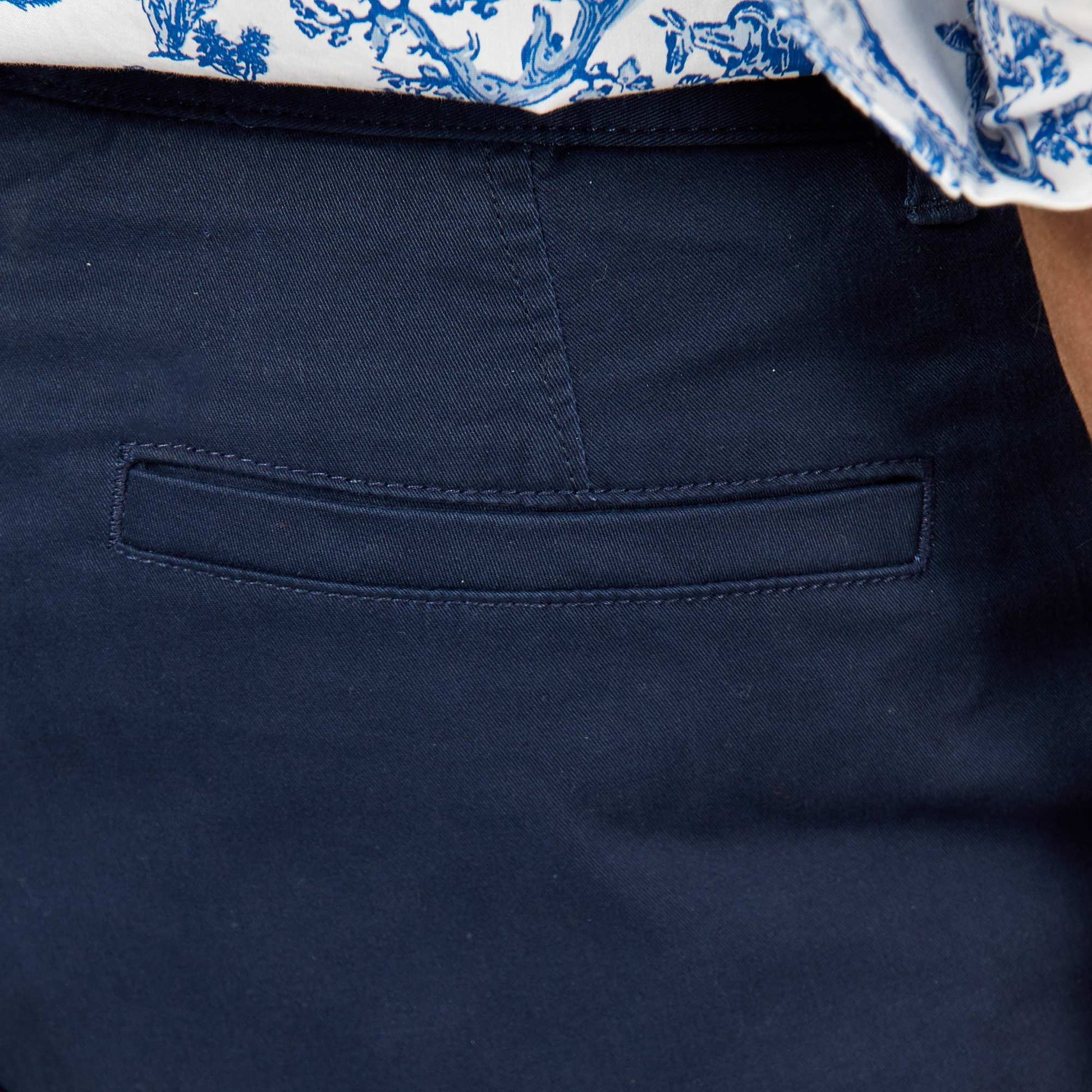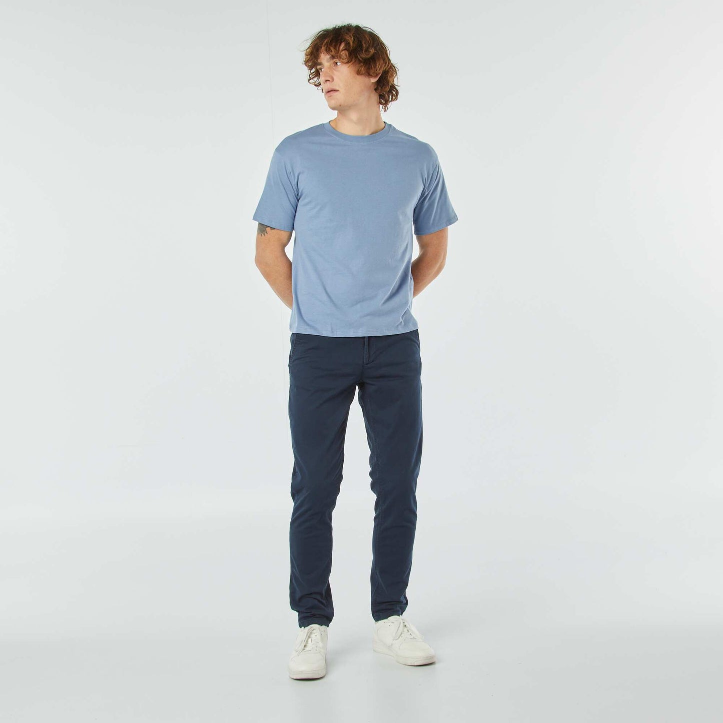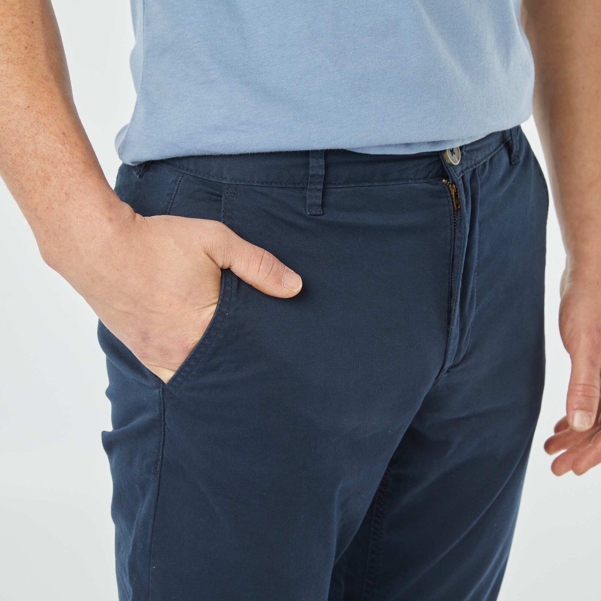 L'incontournable chino revu et corrigé en coupe slim, et dans un beau twill de coton stretch. A porter roulotté au bas des jambes pour un petit look casual chic au top ! ;-) \nPlongez dans le style décontracté et élégant avec notre chino slim à 5 poches en twill de coton stretch. Un véritable essentiel dans la garde-robe masculine. \n\n- Chino slim à coupe ajustée pour une silhouette moderne et sophistiquée.\n- Confectionné en twill de coton stretch pour un confort optimal et une grande liberté de mouvement.\n- Taille standard avec passants pour ceinture, vous permettant de personnaliser votre look en ajoutant une ceinture tendance.\n- Fermeture éclair avec bouton pour une tenue sécurisée et facile à ajuster.\n- 2 poches avant pratiques pour garder vos essentiels à portée de main.\n- 2 poches factices au dos ajoutant une touche de raffinement au design.\n- Longueur entrejambe : 81 cm environ \n- Largeur bas de jambe : 19 cm environ \n\n- Notre mannequin porte une taille 40 et mesure 1m87\n\nConseil mode / association:\nLe Chino Slim à 5 poches en twill de coton ttretch se marie parfaitement avec un style décontracté chic. Pour une tenue casual au bureau, associez-le à une chemise en denim légèrement retroussée aux manches et à des sneakers en cuir blanc pour un look contemporain. Vous pouvez également l'associer avec un t-shirt simple et des baskets pour une journée de détente en ville. Avec ce chino polyvalent, les possibilités sont infinies et le style est toujours au rendez-vous.