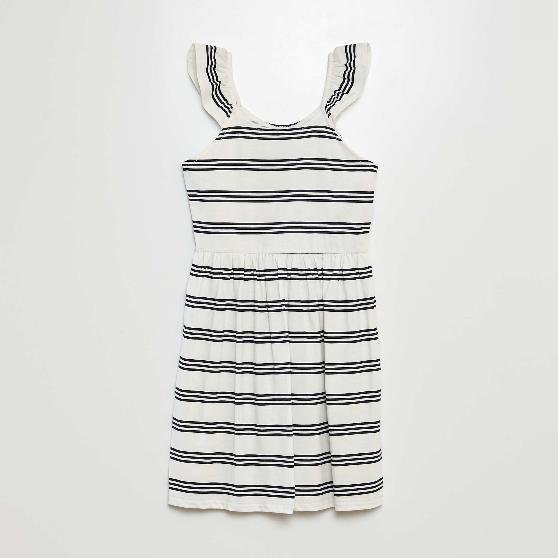 Une robe en jersey imprimée avec des bretelles volantées ! \n\n- Robe à bretelles volantées \n- En jersey \n- Longueur : mi-cuisse \n- Encolure ronde \n- Bretelles volantées \n- Motif all over