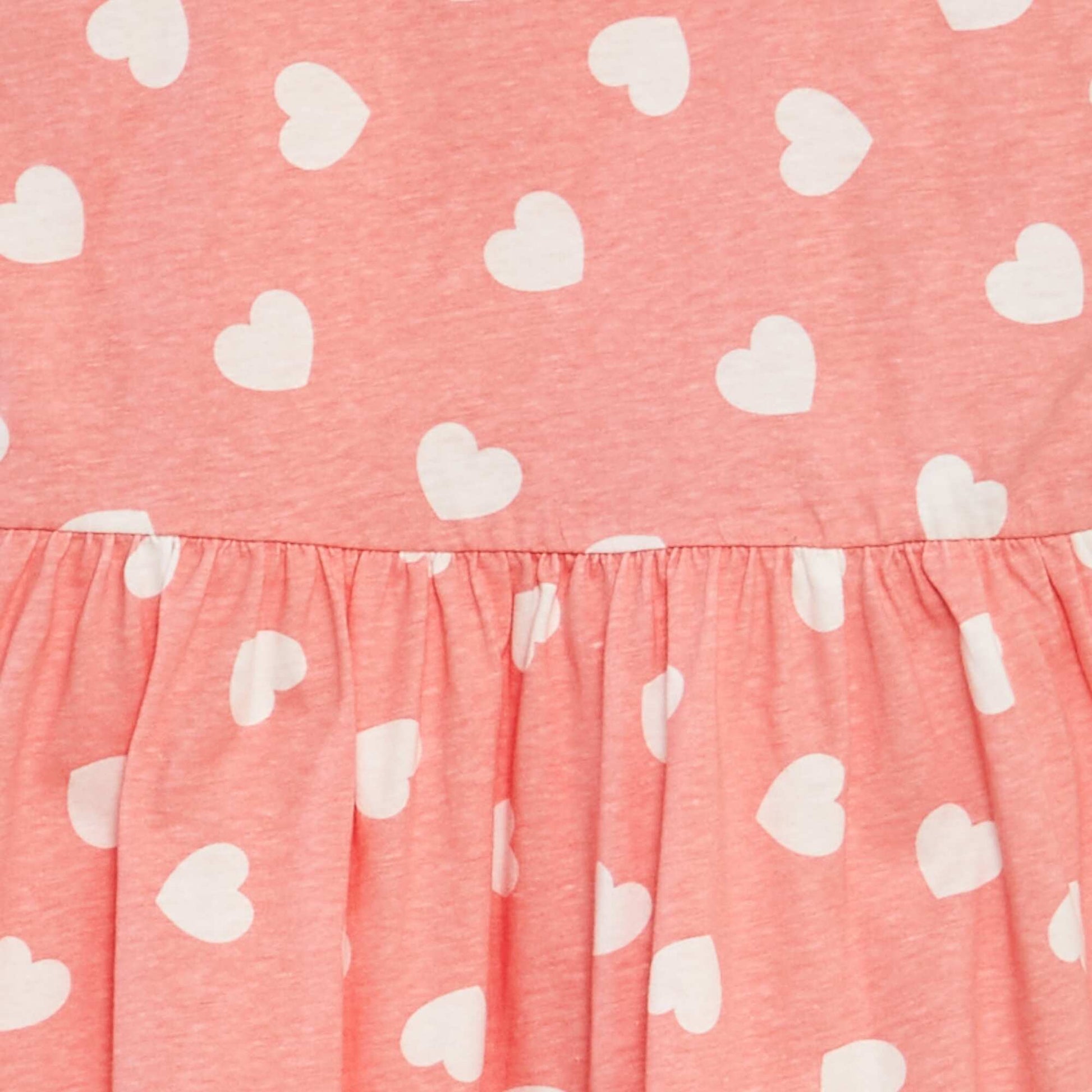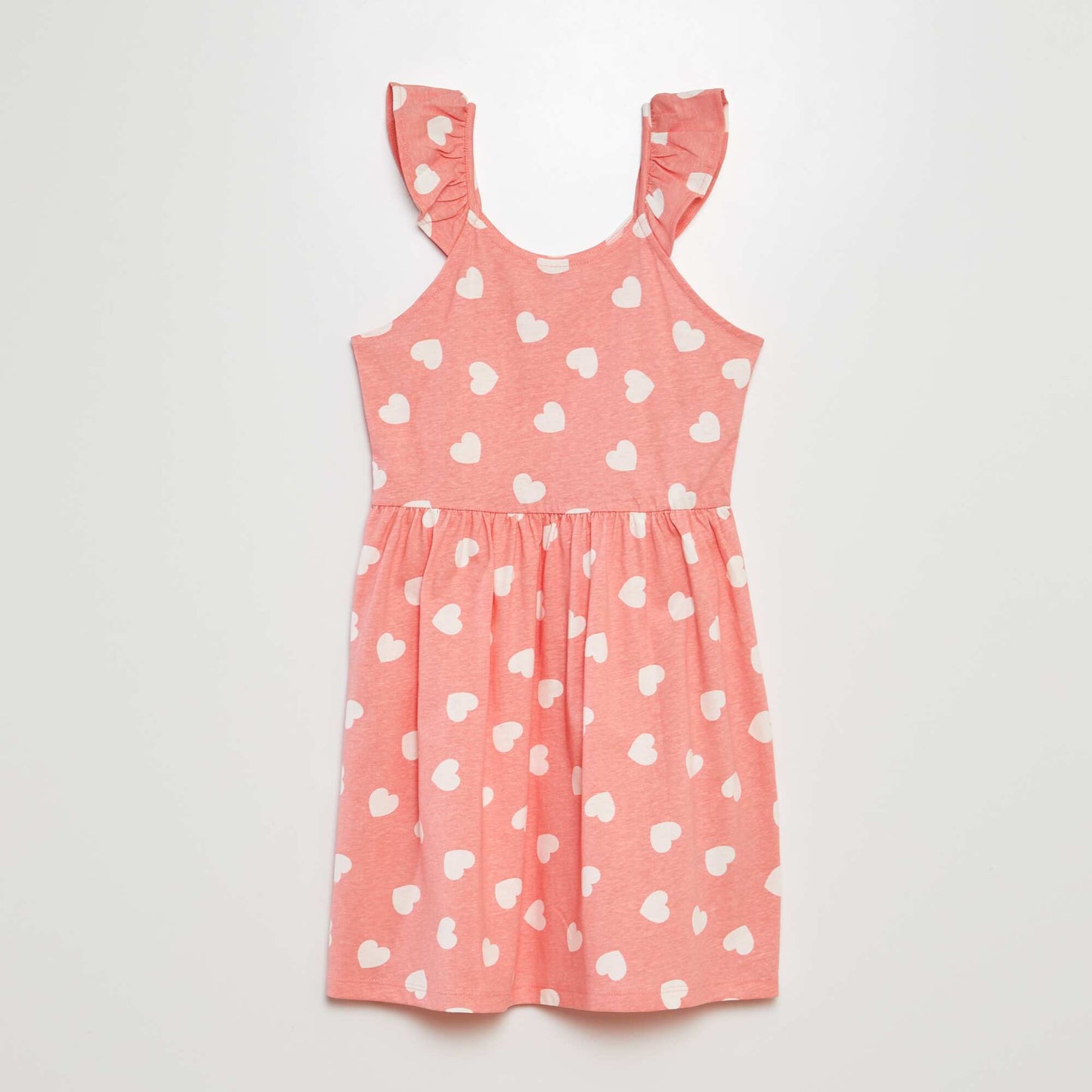 Une robe en jersey imprimée avec des bretelles volantées ! \n\n- Robe à bretelles volantées \n- En jersey \n- Longueur : mi-cuisse \n- Encolure ronde \n- Bretelles volantées \n- Motif all over