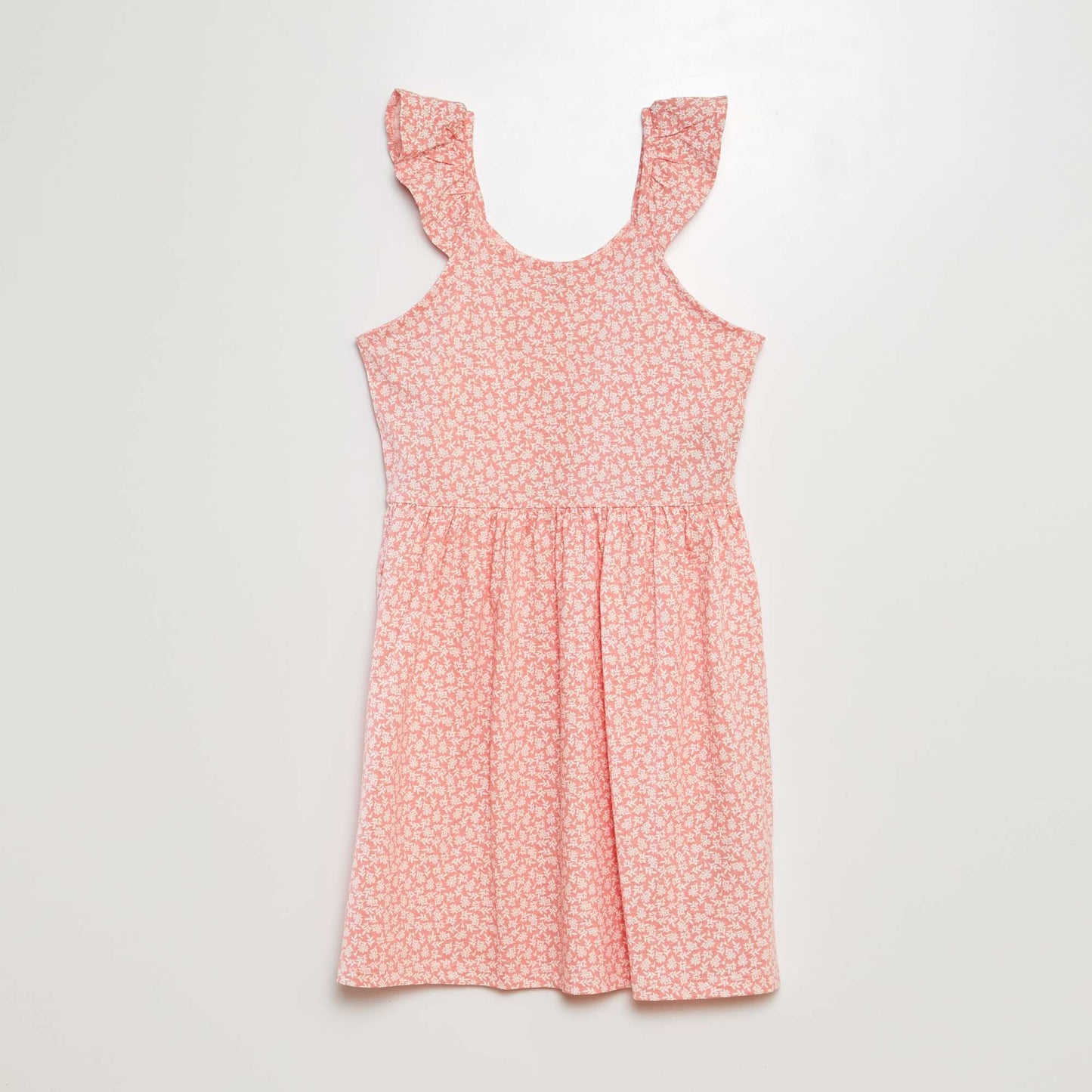 Une robe en jersey imprimée avec des bretelles volantées ! \n\n- Robe à bretelles volantées \n- En jersey \n- Longueur : mi-cuisse \n- Encolure ronde \n- Bretelles volantées \n- Motif all over