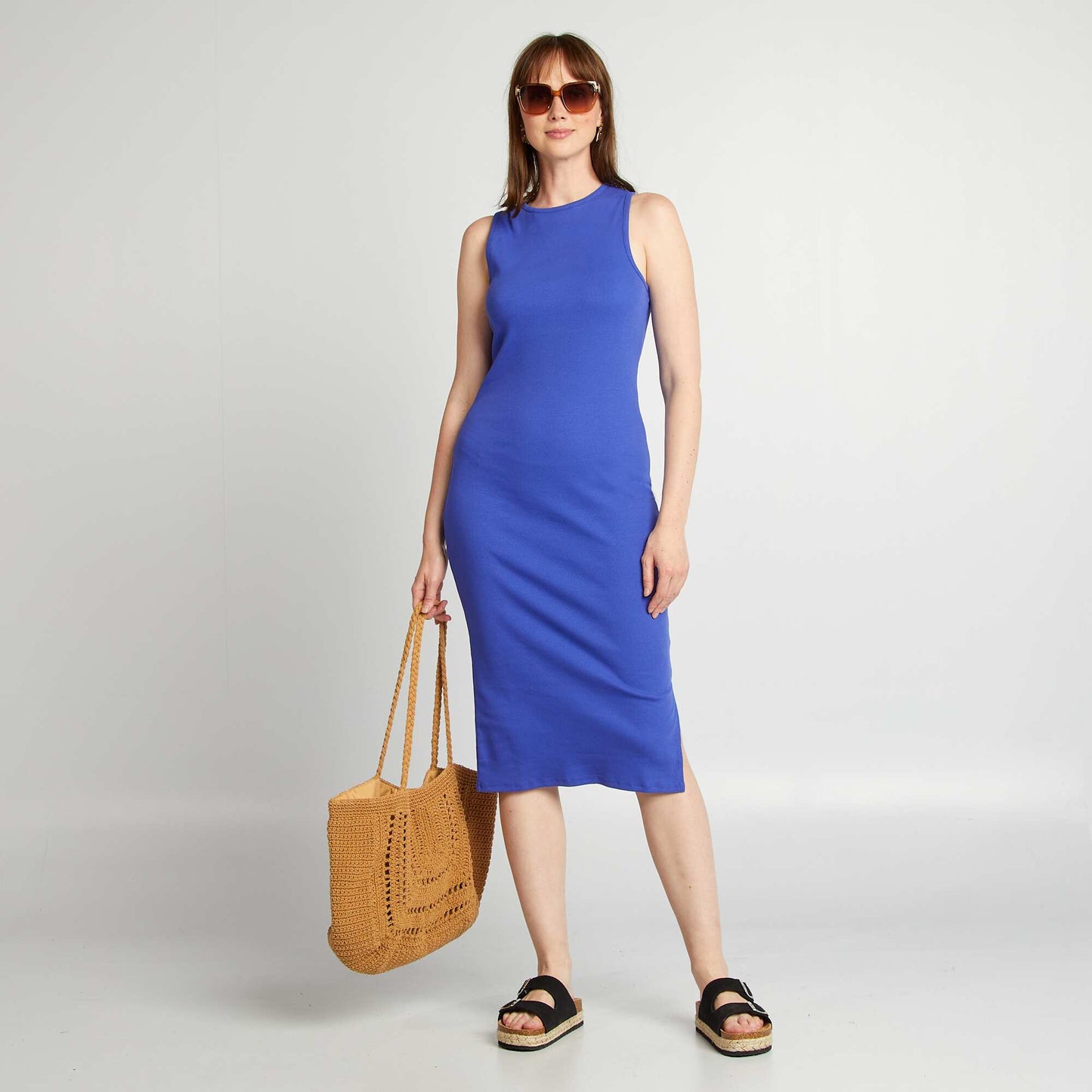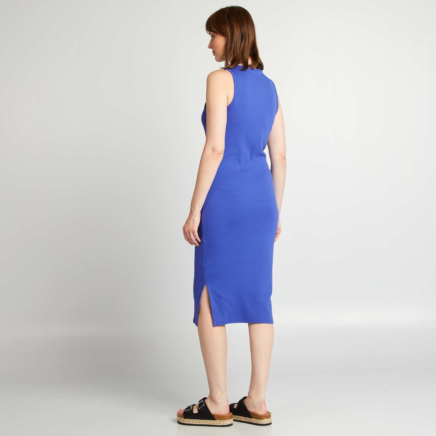 Redécouvrez le style et la simplicité avec cette pièce essentielle de votre garde-robe. - Robe midi - En maille côtelée - Col rond - Emmanchures américaines - Couleur unie - Longueur du dos : 114 cm - Notre mannequin porte une taille S et mesure 1m76
